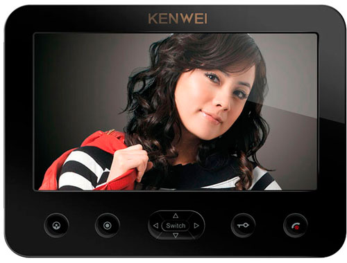 Kenwei E705C (black) - цветной видеодомофон из Южной Кореи без трубки с 7" LCD дисплеем, функция интерком с аудиотрубками, громкая связь, 4-х проводное соединение. В комплекте с домофоном инструкция, кронштейн и монтажный набор.